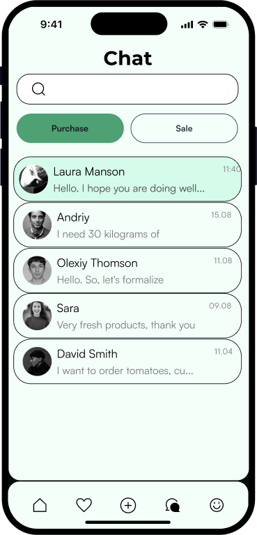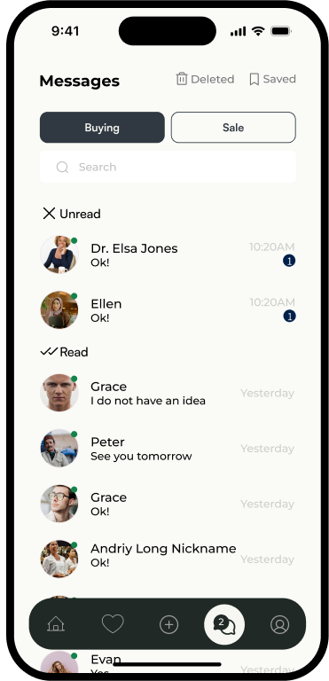 The app's chat screen makes it easy to navigate thanks to its simple and user-friendly design. The user can filter messages by “Purchase” and “Sale” categories, search for desired chats via the search bar and quickly browse the list of conversations where avatars, names and recent messages are displayed.