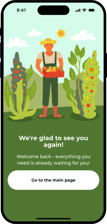 The welcome screen reminds you that you are always welcome! A simple message creates a warm atmosphere and a large “Go to the main page” button makes it easy to navigate to the main functions of the app.