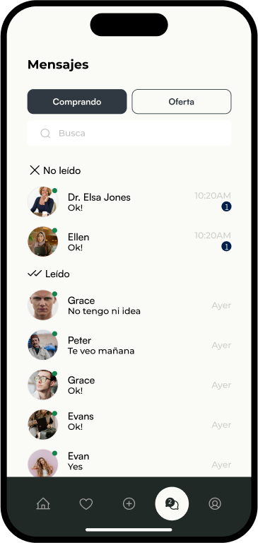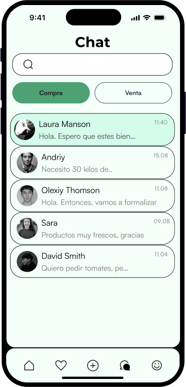 La pantalla del chat de la aplicación facilita la navegación gracias a su diseño simple y fácil de usar. El usuario puede filtrar los mensajes por categorías “compra” y “venta”, buscar los chats deseados a través de la barra de búsqueda y navegar rápidamente por la lista de conversaciones donde se muestran avatares, nombres y mensajes recientes.